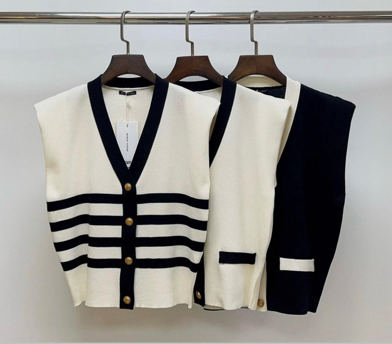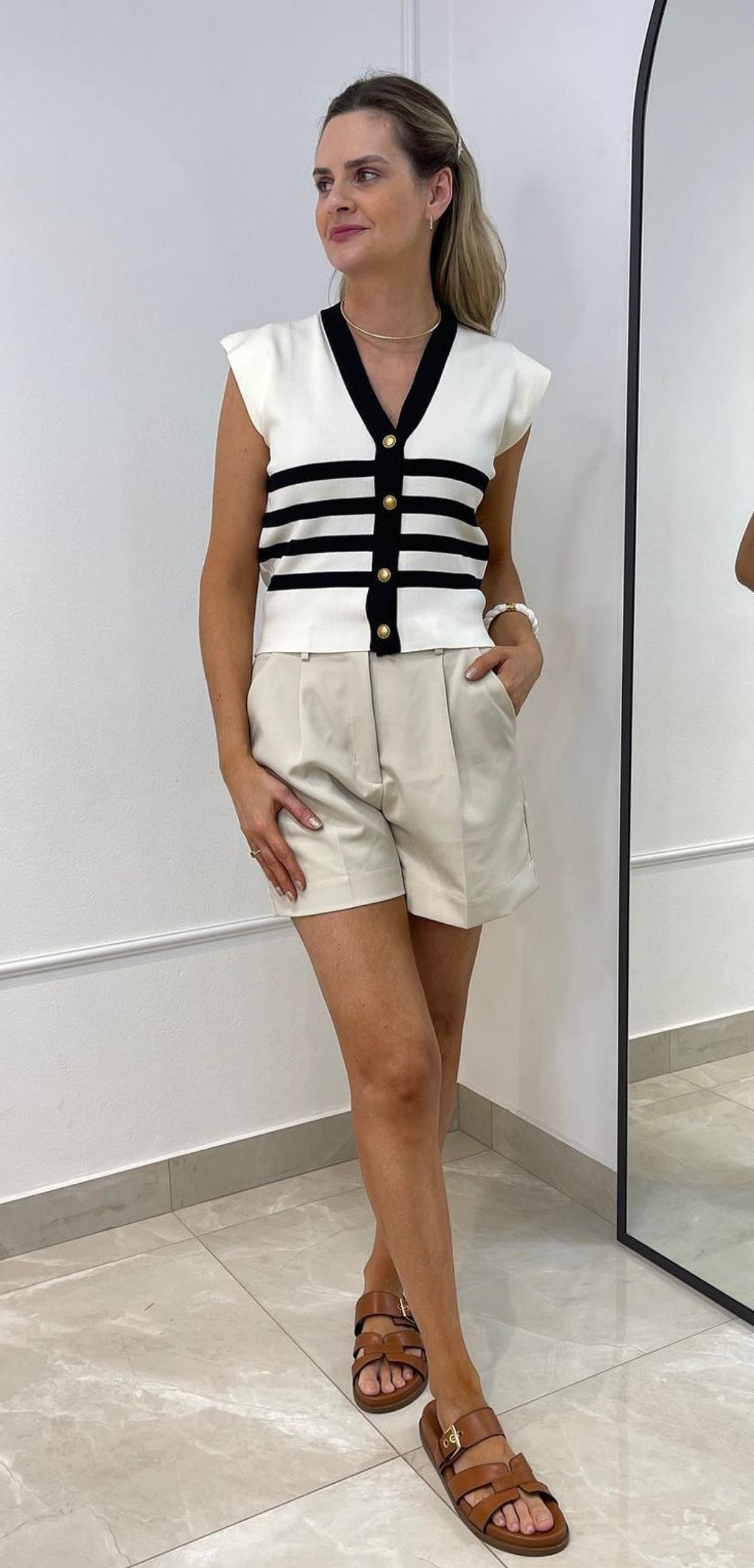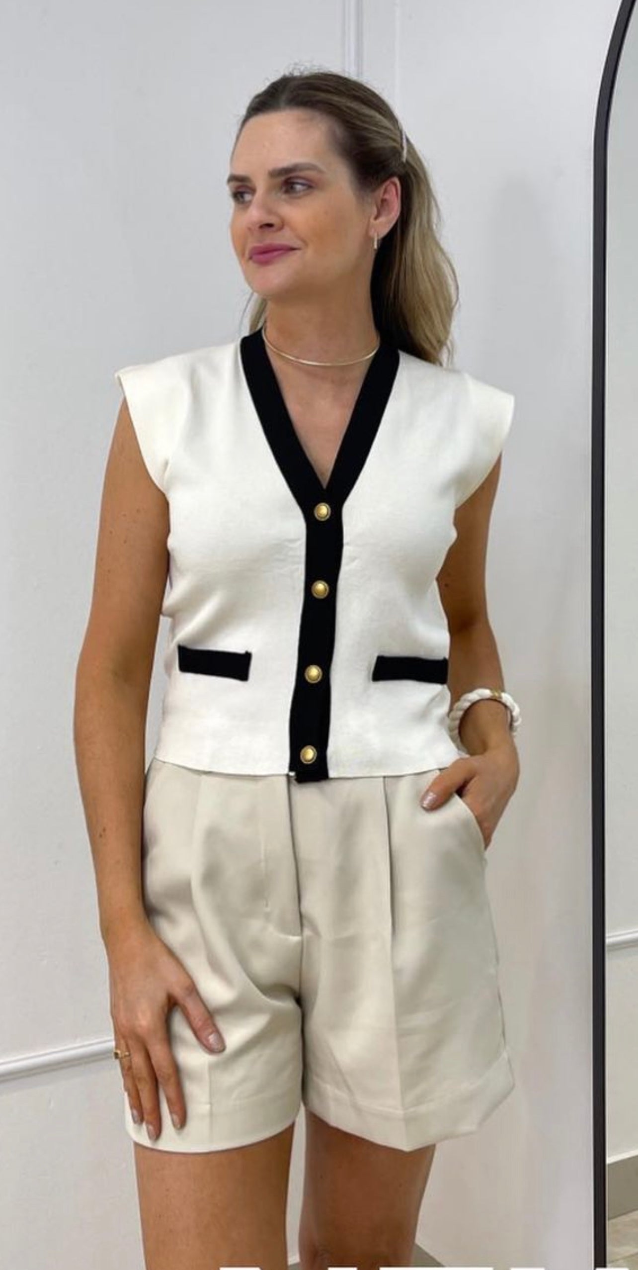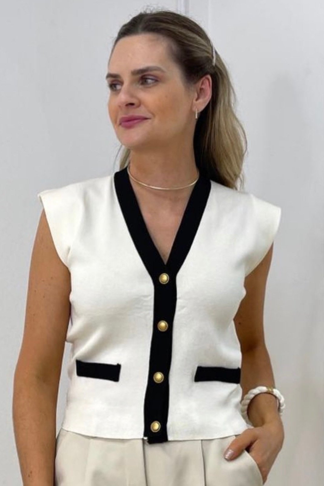 Blusa estilo colete com botões dourados em modal fresh.