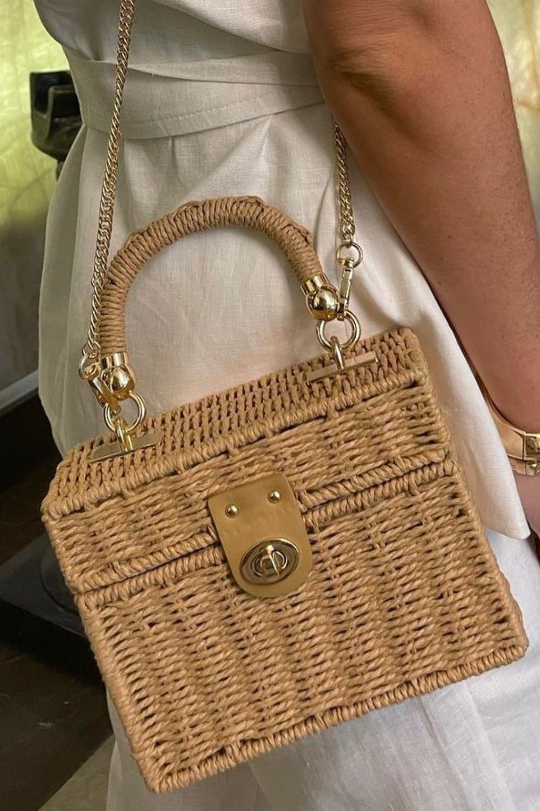 Bolsa de palha pequena tiracolo quadrada baú com corrente dourada.