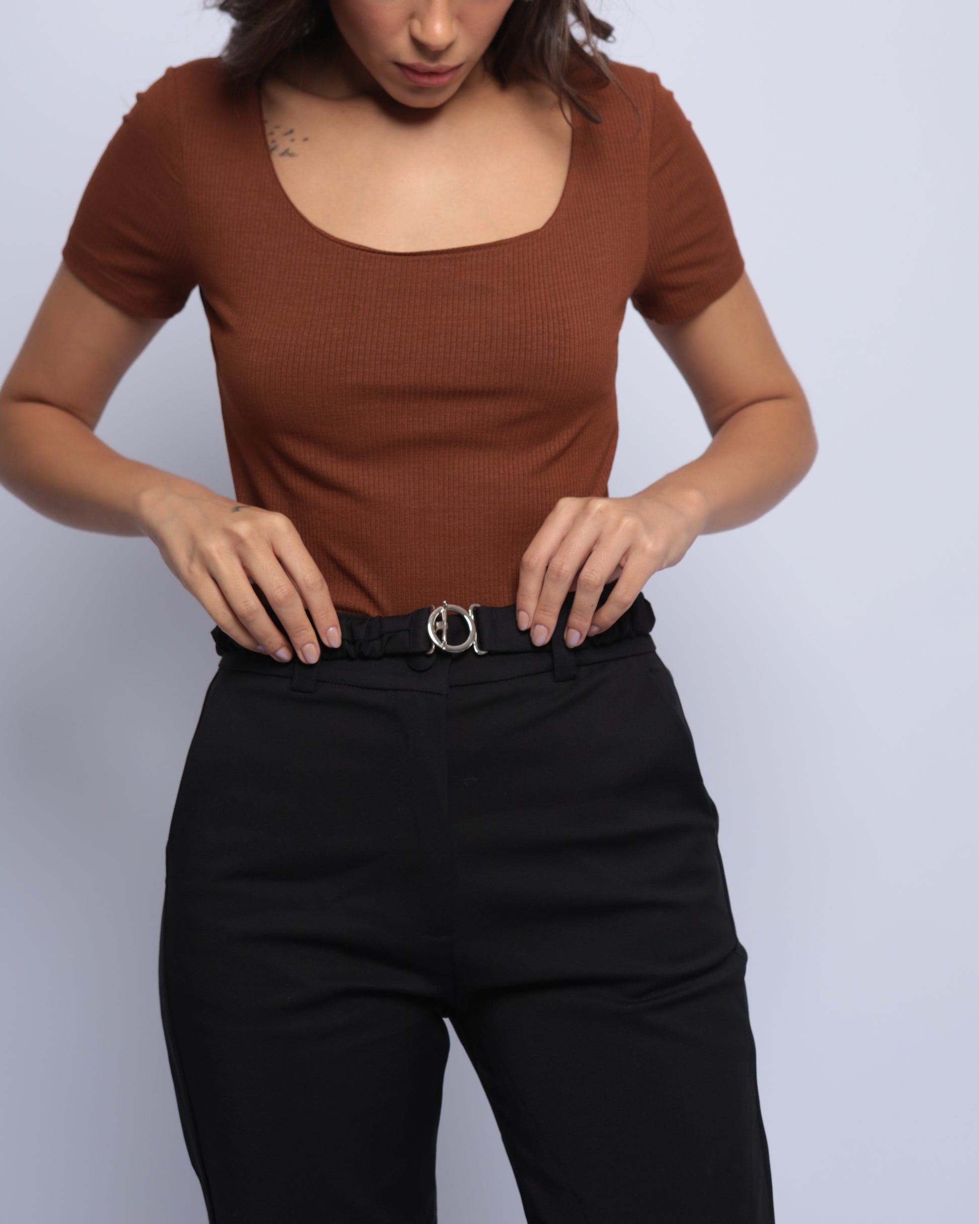 Calça produzida em alfaiataria, um tecido estruturado com caimento elegante.