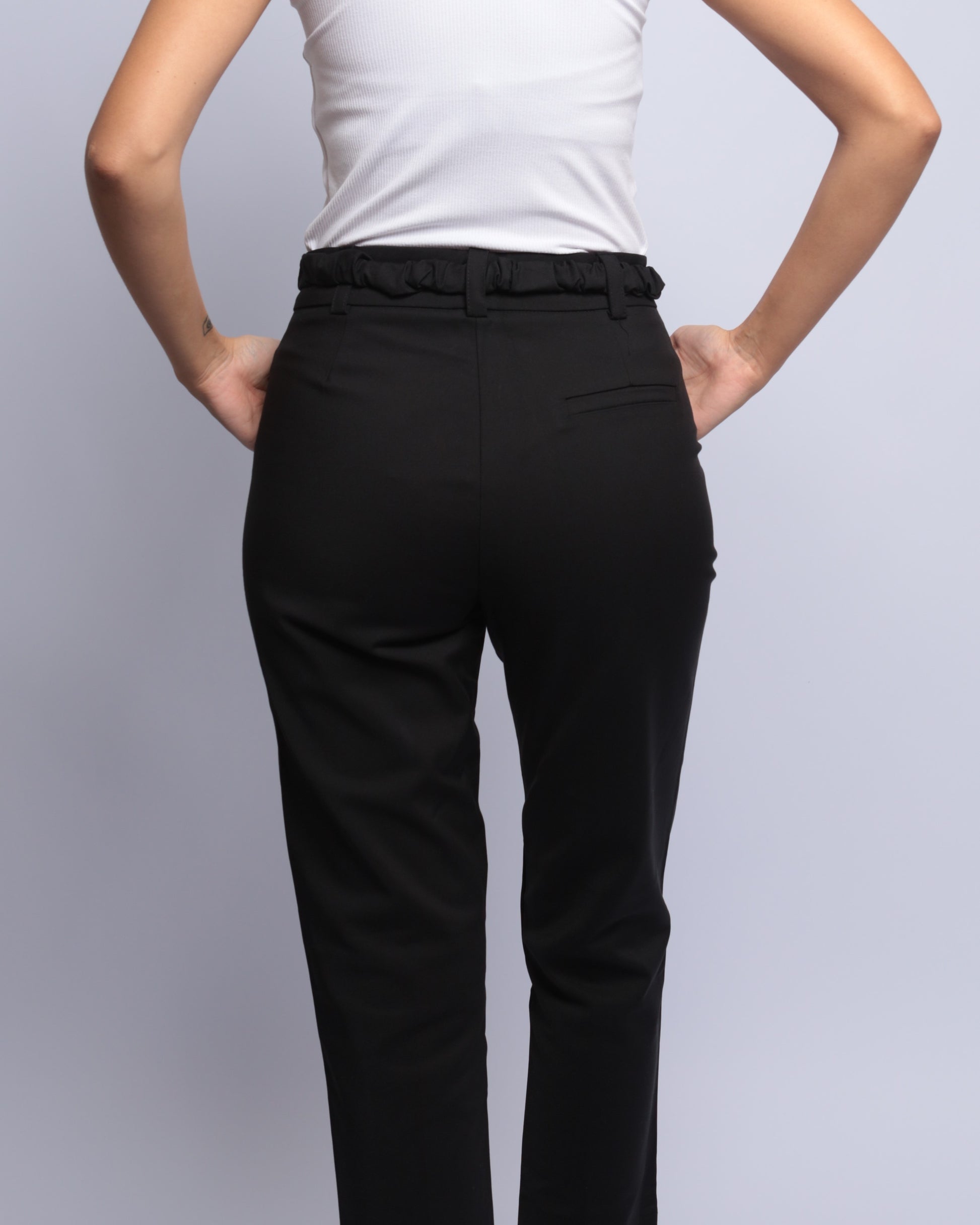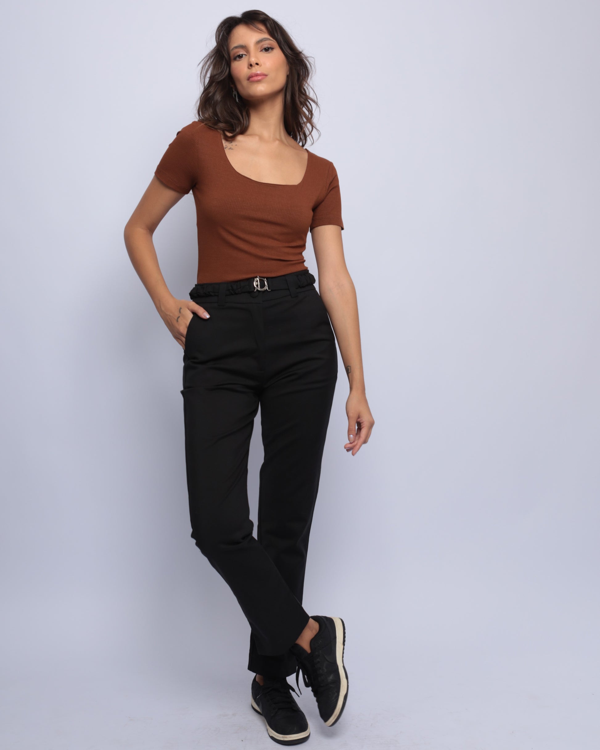 Possui cintura alta, modelagem cigarrete, bolsos laterais modelo faca, bolso embutido posterior, fechamento frontal por zíper fixo e botão forrado, cós com passantes aplicados, pences posteriores para melhor encaixe e detalhe em fenda na barra.