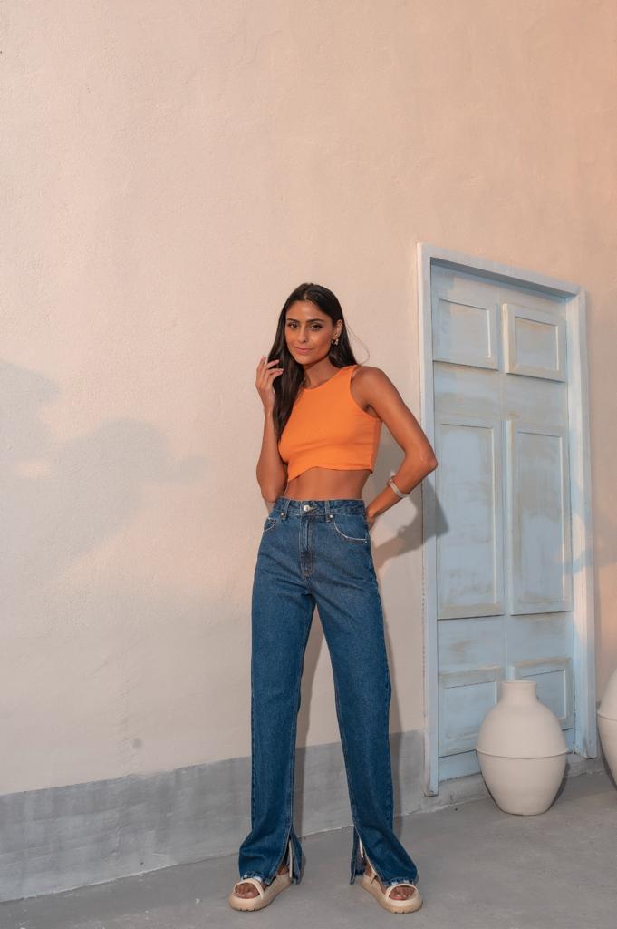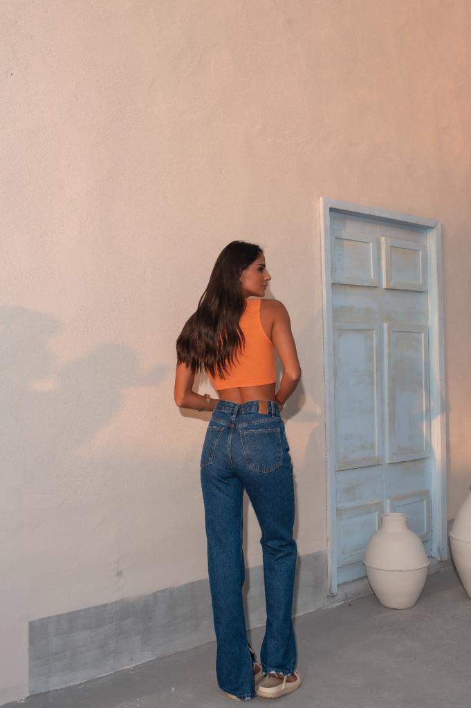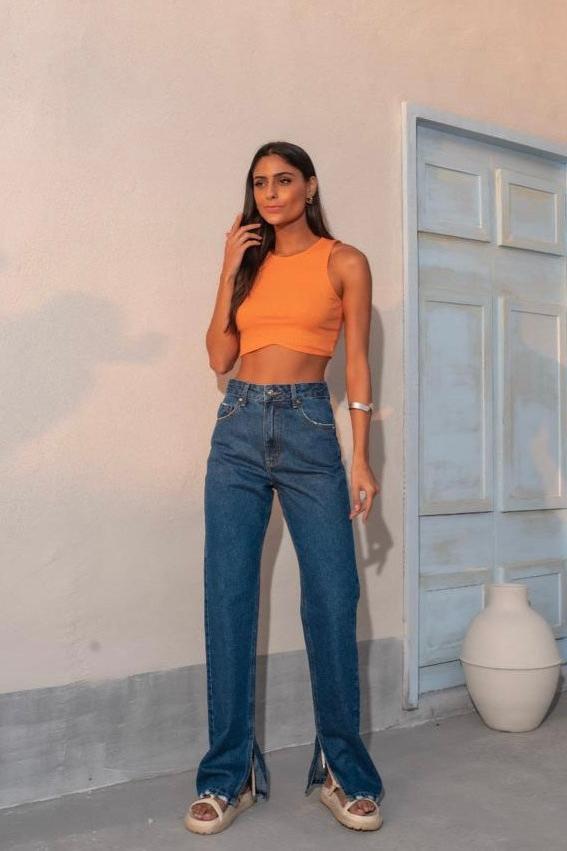 Calça jeans reta 100% algodão com abertura entre as pernas.