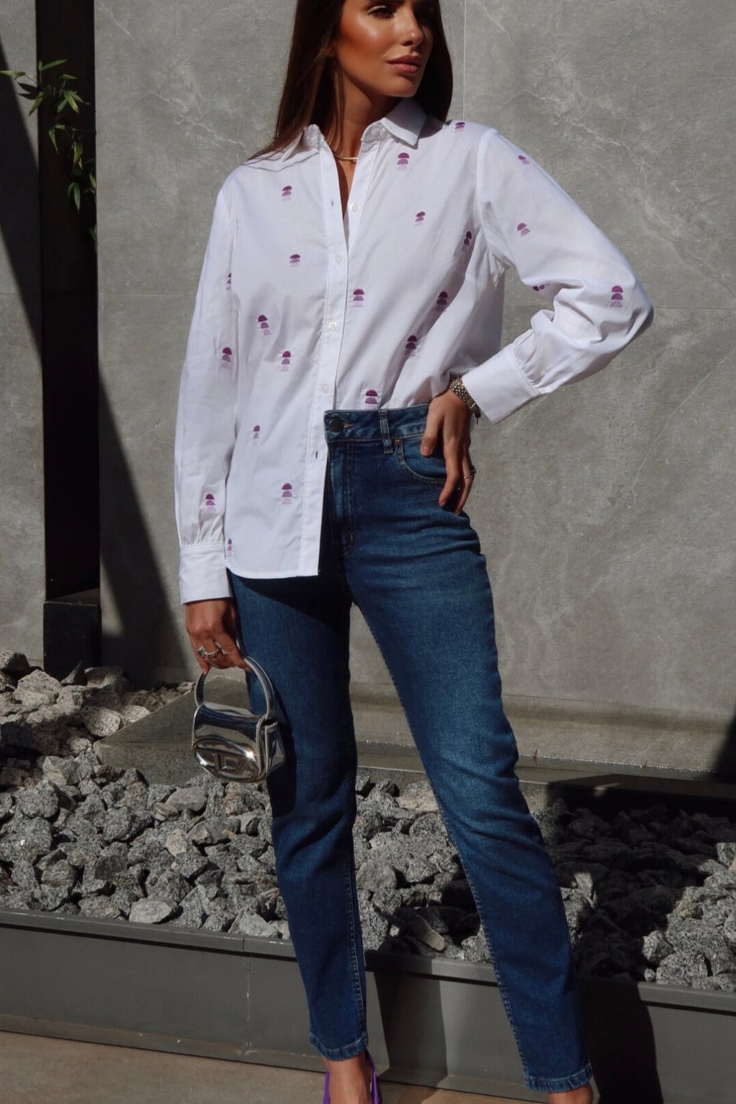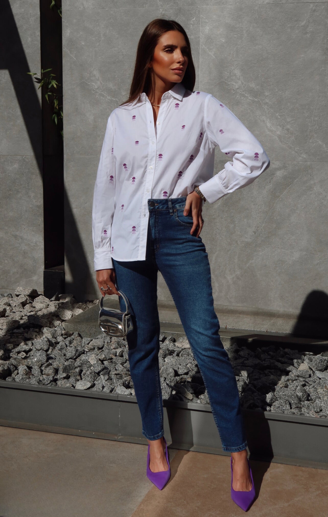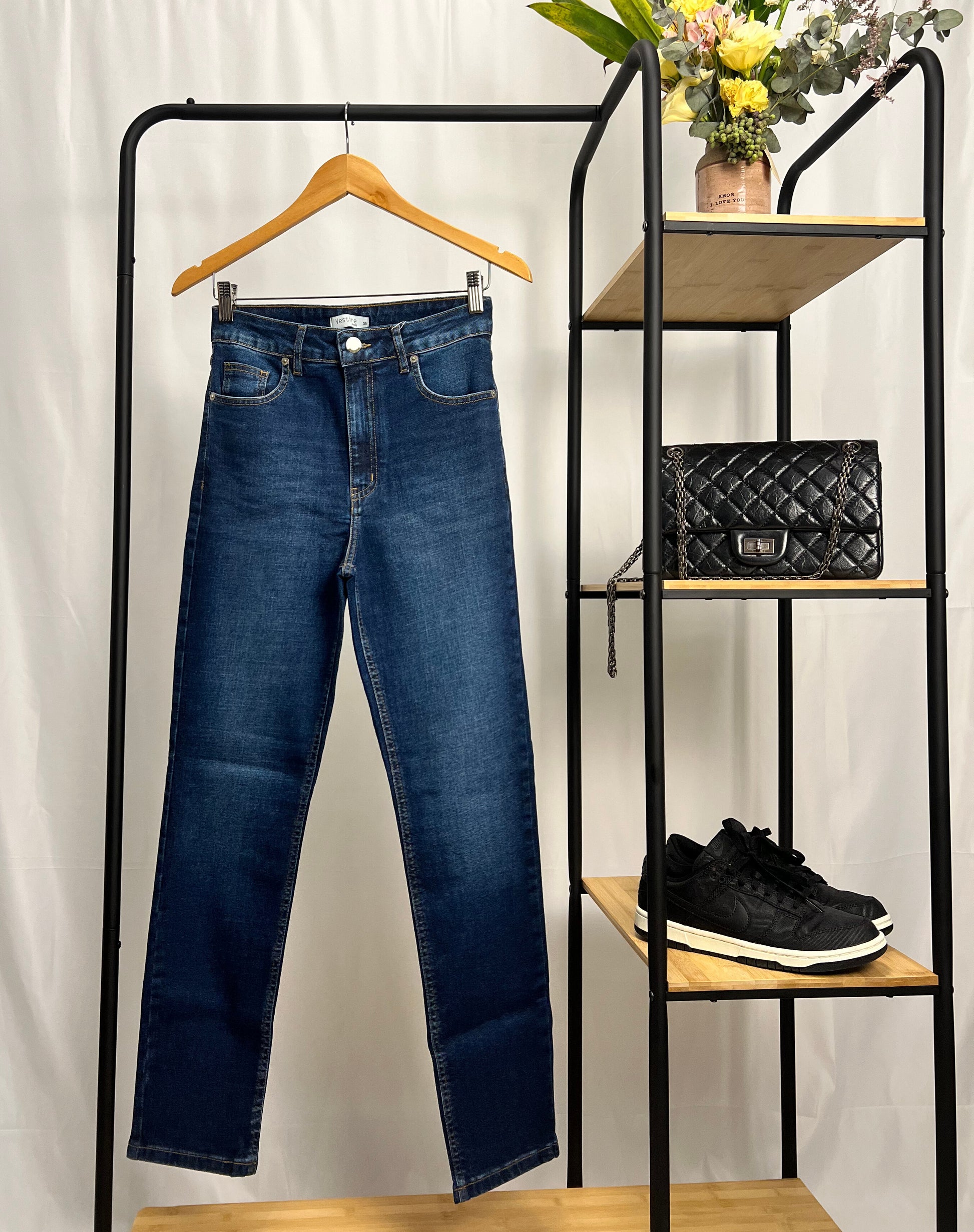 Calça jeans cintura alta fabricada com algodão e elastano.