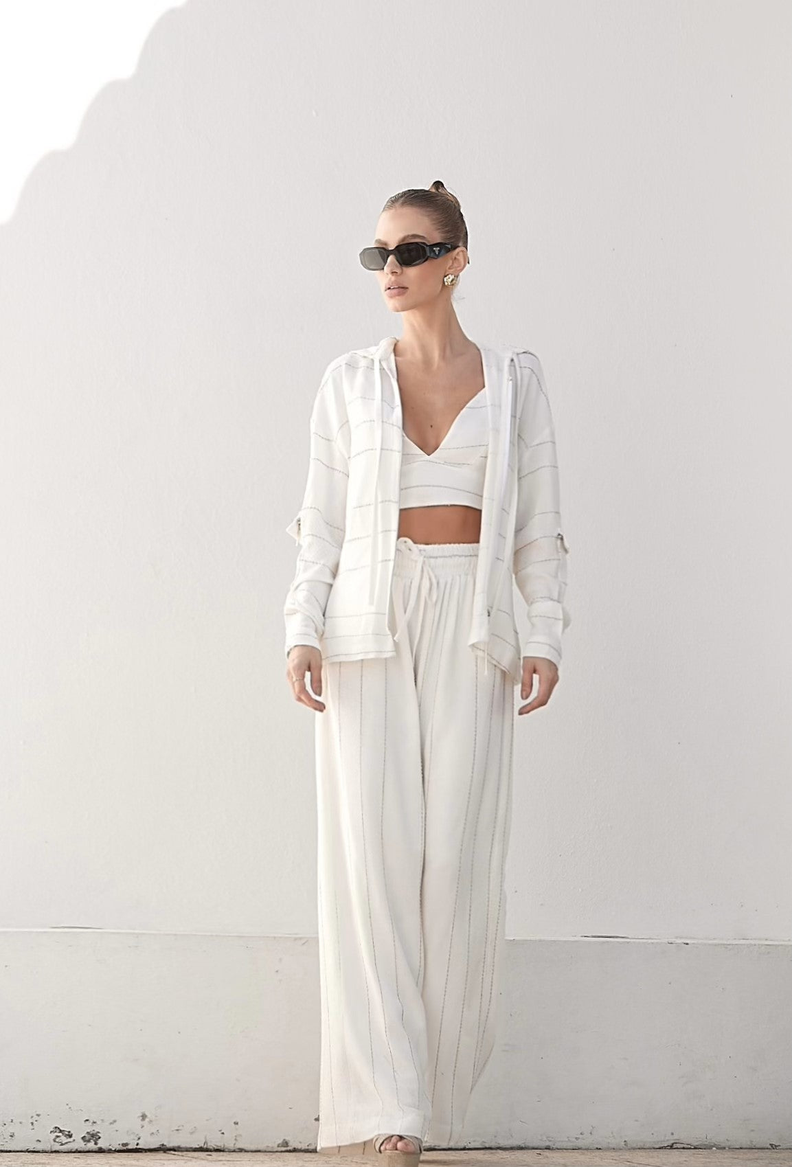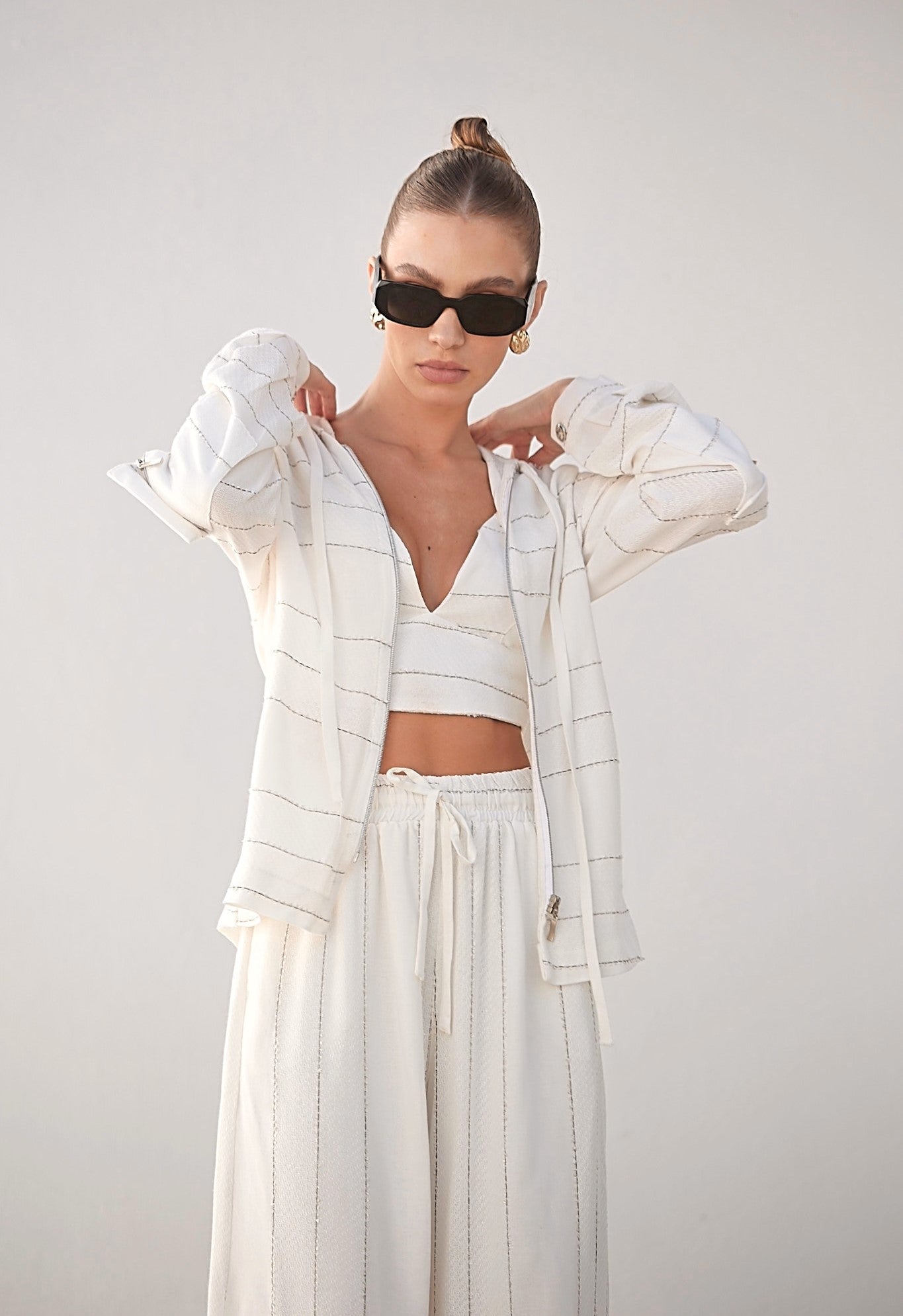 A camisa com capuz é a peça central desse conjunto, oferecendo um toque moderno e prático. O capuz adiciona um detalhe diferenciado, garantindo um visual despojado e sofisticado ao mesmo tempo.