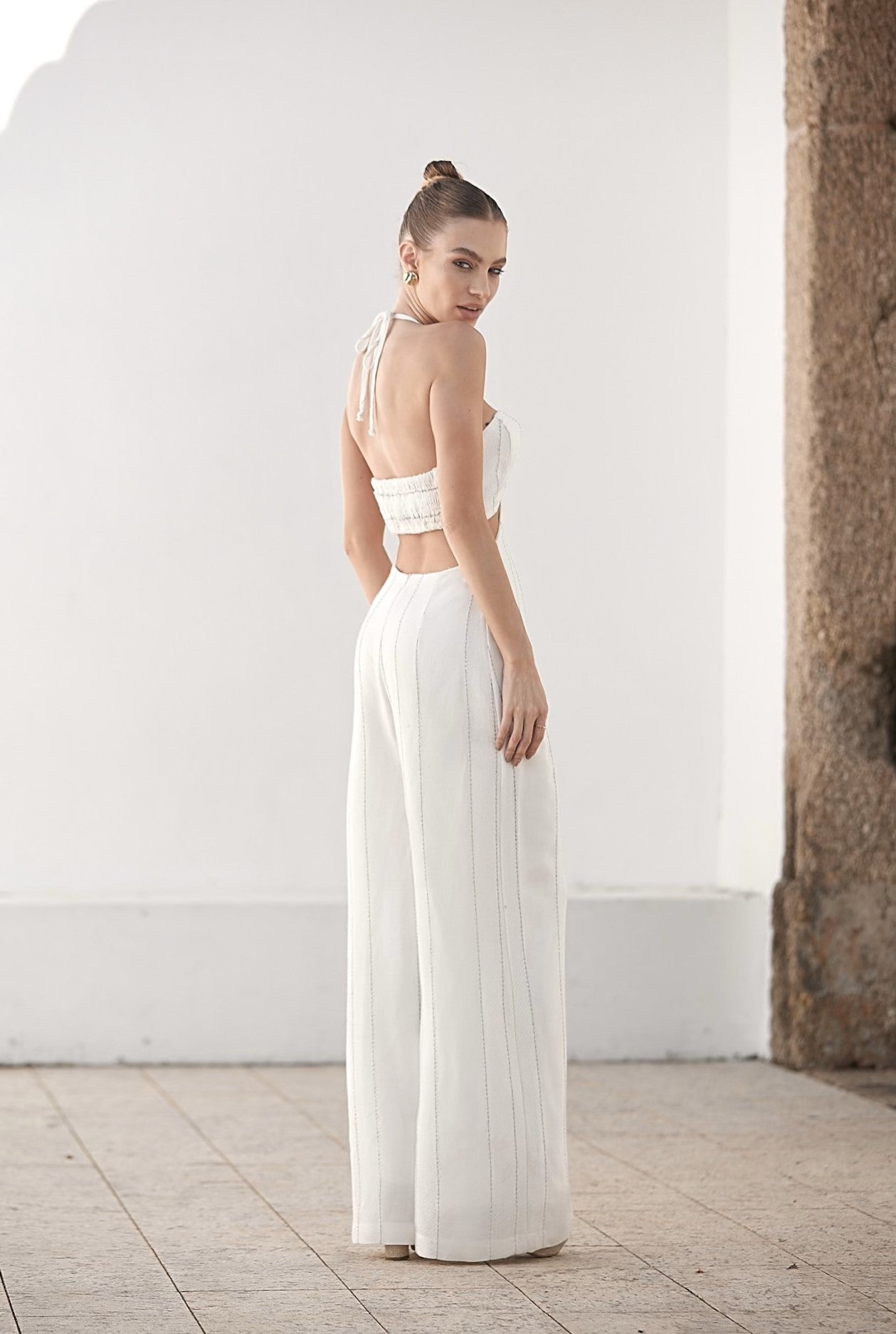 O macacão Positano possui uma modelagem encantadora, confeccionado em uma combinação de linho, algodão e sutis de lurex.