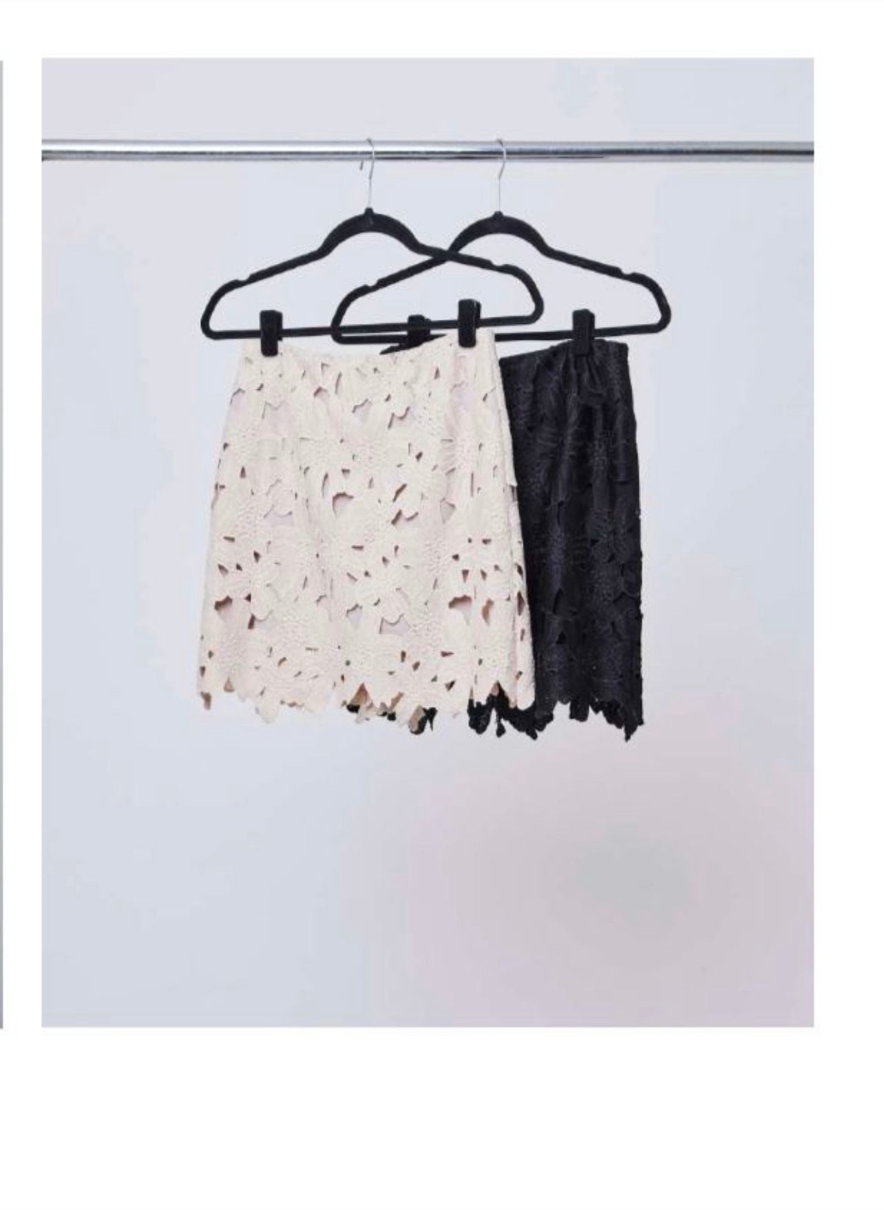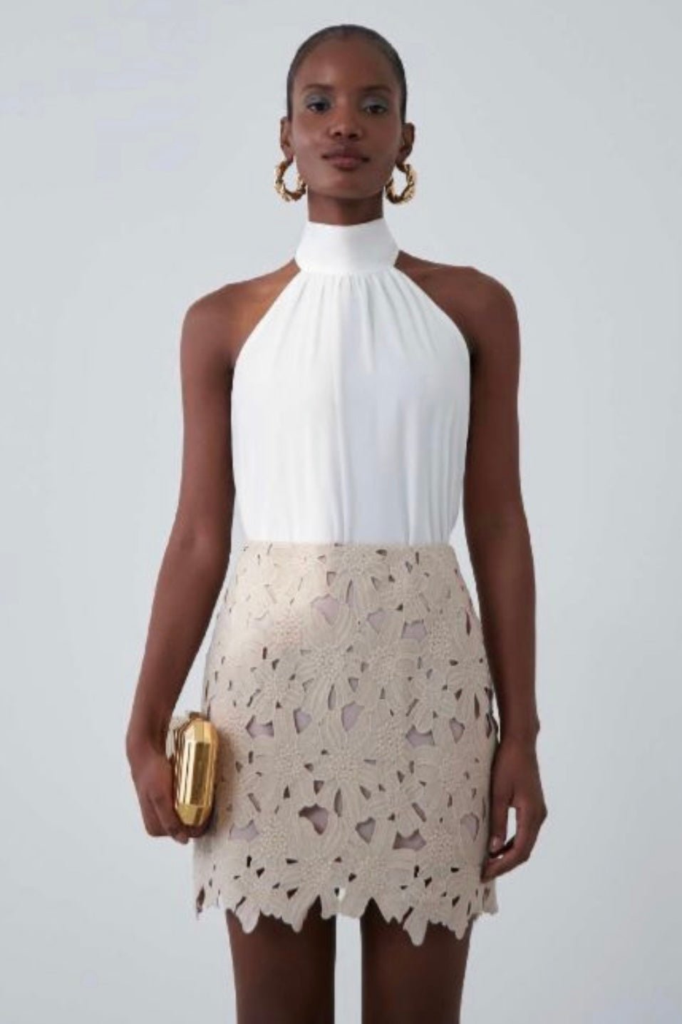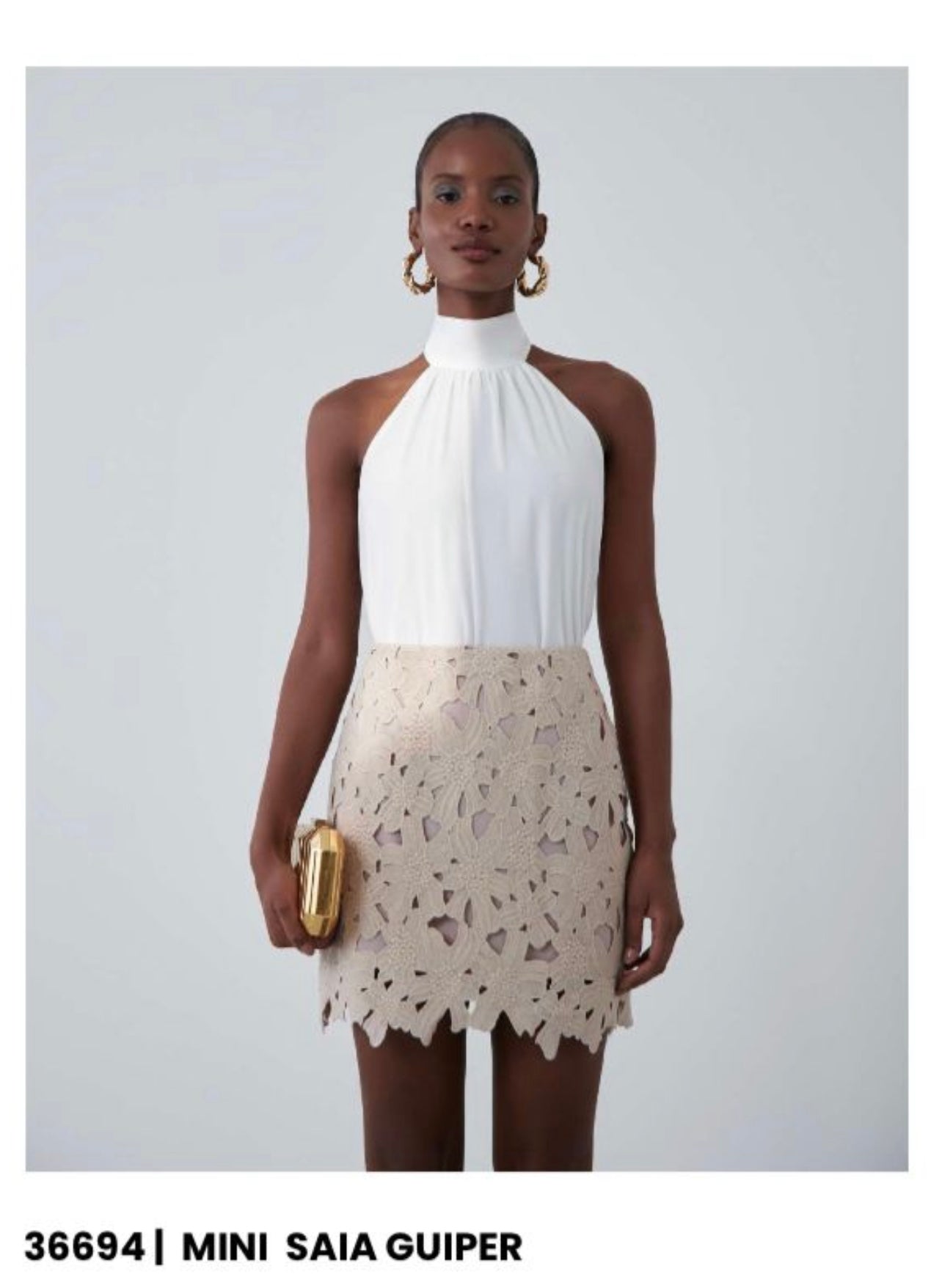 Saia curta Esmeral em renda guipir com recortes a laser.