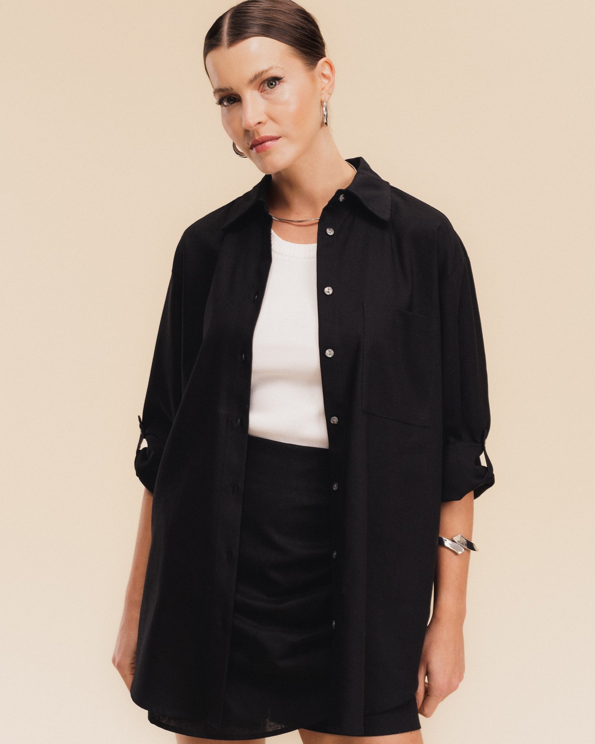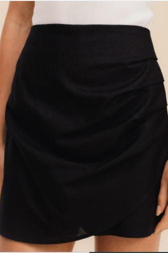 Shorts saia confeccionado em linho, com caimento reto, tecido estruturado e resistente. Possui pence traseira. Fechamento no traseiro com zíper invisível. Destaque na saia frontal com pregas na lateral, que proporciona um look único e moderno.