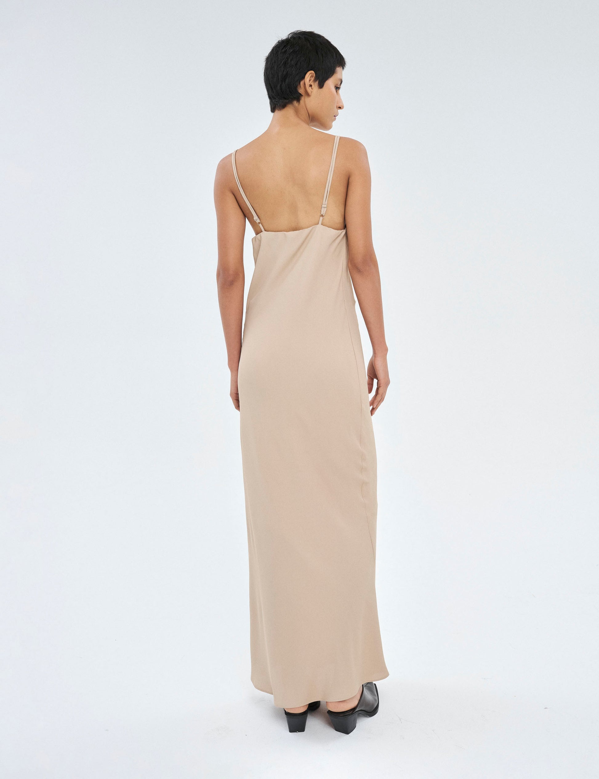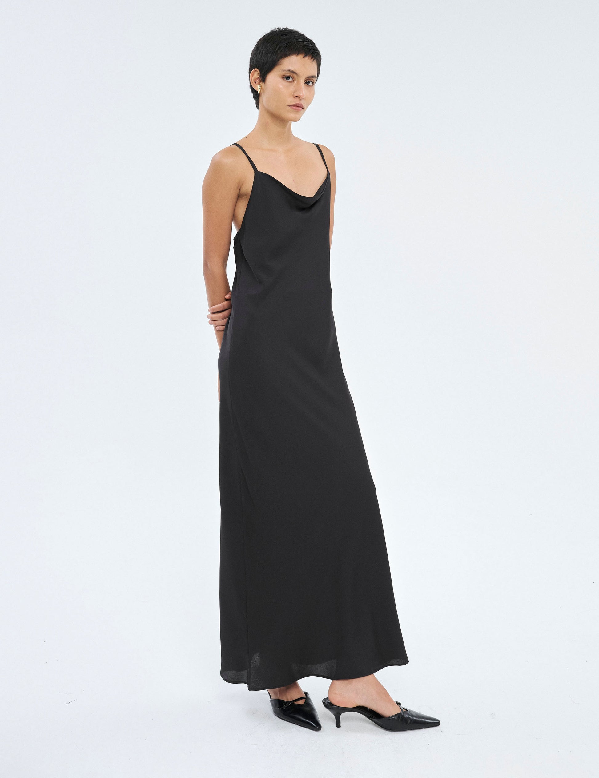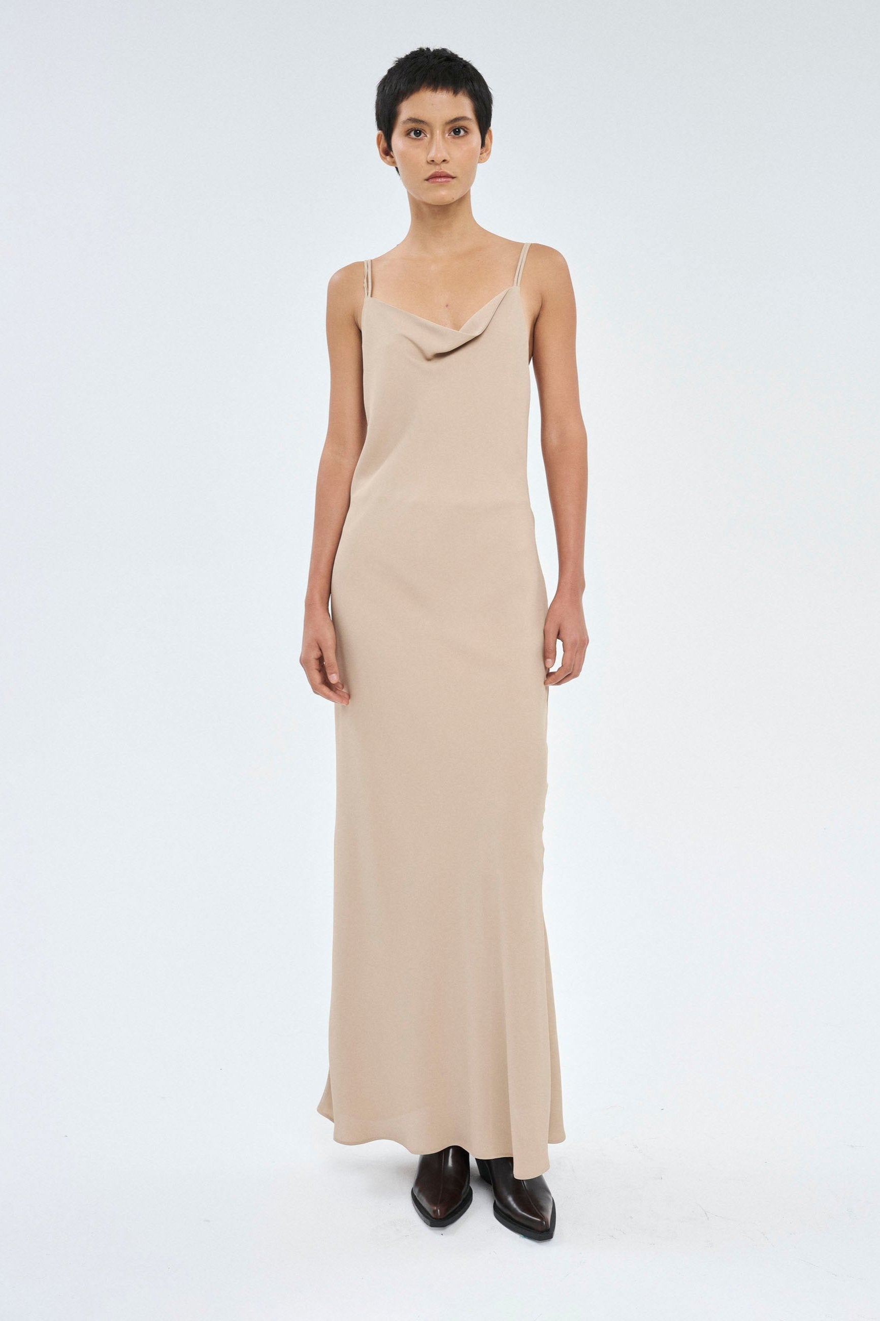 O vestido Vero confeccionado em crepe apresenta um tecido leve e fluido, que proporciona um caimento elegante e confortável ao vestir.